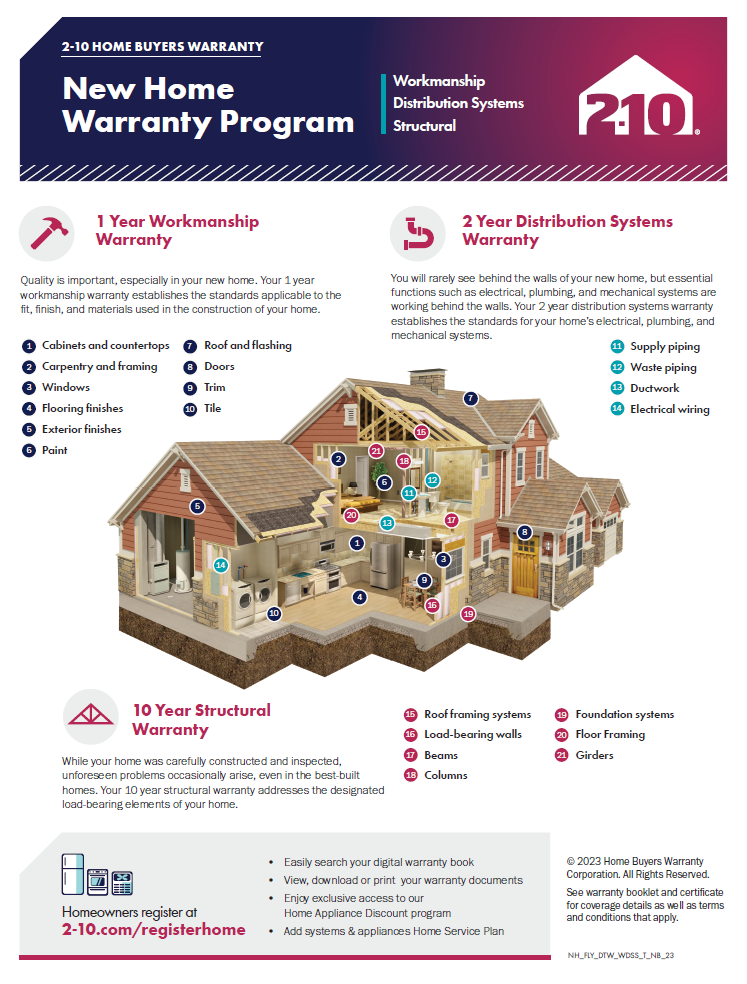 Your warranty also provides clearly defined coverage standards and a helpful Maintenance Guide to keep your home performing at its best. For full details or to file a claim, please reference your 2-10 warranty booklet, log into your Homeowner Portal, or call 855.429.2109.